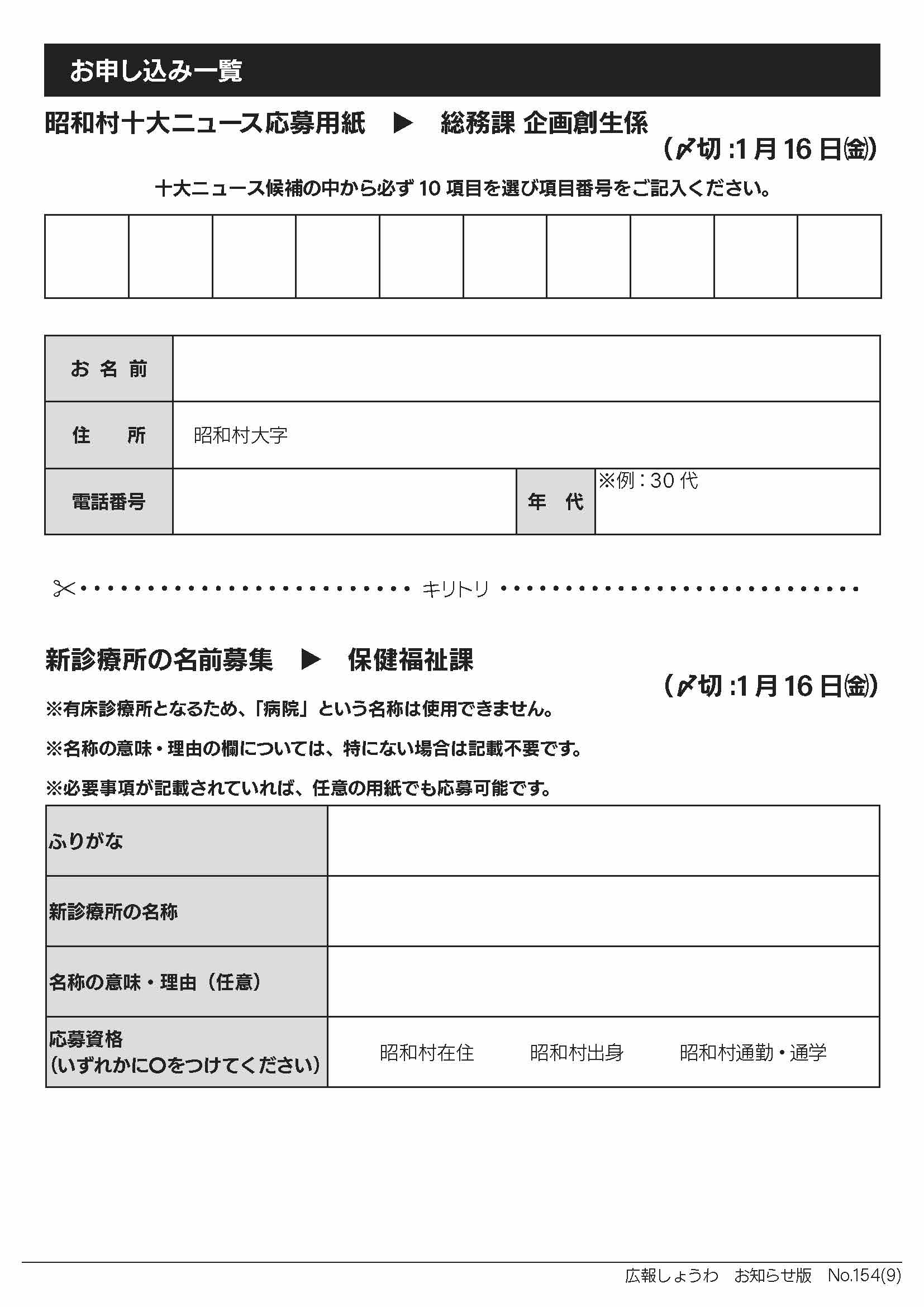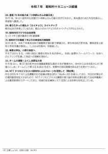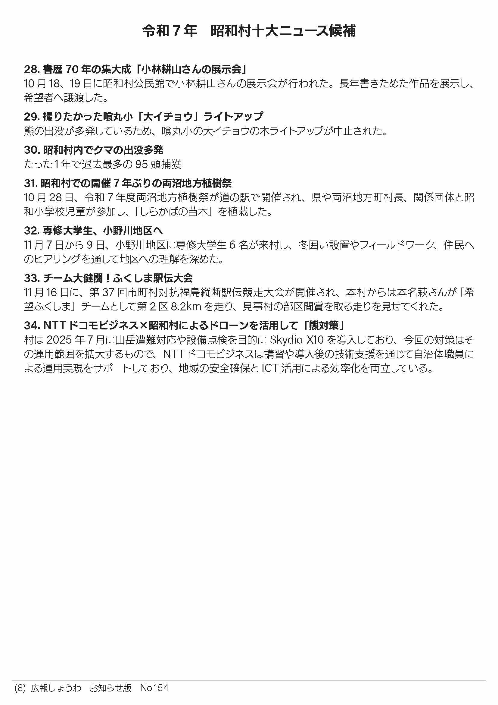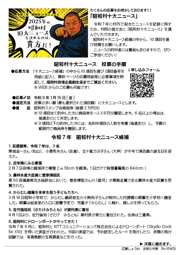 2025 12 17 お知らせ 広報・広聴 令和7年 昭和村十大ニュース募集 令和7年に村内で起きたニュースを記録に残すため、村民の皆さま方に「昭和村十大ニュース」を選らんでいただきます。 令和7年の昭和村の歴史に何を刻むかは、あなたの投票次第です! 十大ニュースの応募はこちらから 十大ニュース候補はこちらからも確認できます(PDF)