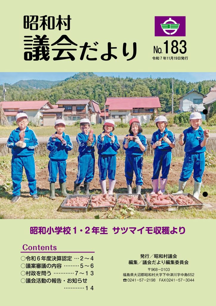 昭和村議会 議会だより 第133号 平成25年6月5日発行の議会だよりからご覧頂けます。 目次最新号バックナンバー 最新号 第183号 令和7年11月19日発行(PDF) バックナンバー 令和7年 第182号 令和7年9月3日発行(PDF) 第181号 令和7年5月21日発行(PDF) 令和6年 第180号 令和7年2月19日発行(PDF) 第179号 令和6年11月20日発行(PDF) 第178号 令和6年8月21日発行(PDF) 第177号 令和6年6月5日発行(PDF) 令和5年 第176号 令和6年2月21日発行(PDF) 第175号 令和5年11月15日発行(PDF) 第174号 令和5年8月23日発行(PDF) 第173号 令和5年5月24日発行(PDF) 令和4年 第172号 令和5年2月15日発行(PDF) 第171号 令和4年11月16日発行(PDF) 第170号 令和4年8月17日発行(PDF) 第169号 令和4年5月18日発行(PDF) 令和3年 第168号 令和4年2月16日発行(PDF) 第167号 令和3年11月17日発行(PDF) 第166号 令和3年8月18日発行(PDF) 第165号 令和3年5月19日発行(PDF) 令和2年 第164号 令和3年2月17日発行(PDF) 第163号 令和2年11月18日発行 (PDF) 第162号 令和2年8月19日発行(PDF) 第161号 令和2年5月27日発行(PDF) 第160号 令和2年2月19日発行(PDF) 平成31年・令和元年 第159号 令和元年11月20日発行(PDF) 第158号 令和元年8月21日発行(PDF) 第157号 令和元年5月21日発行(PDF) 第156号 平成31年2月13日発行(PDF) 平成30年 第155号 平成30年11月14日発行(PDF) 第154号 平成30年8月8日発行(PDF) 第153号 平成30年5月15日発行(PDF) 第152号 平成30年2月14日発行(PDF) 平成29年 第151号 平成29年11月15日発行(PDF) 第150号 平成29年8月9日発行(PDF) 第149号 平成29年5月10日発行(PDF) 第148号 平成29年2月15日発行(PDF) 平成28年 第147号 平成28年11月16日発行(PDF) 第146号 平成28年8月3日発行(PDF) 第145号 平成28年5月11日発行(PDF) 第144号 平成28年2月18日発行(PDF) 平成27年 第143号 平成27年11月18日発行(PDF) 第142号 平成27年8月5日発行(PDF) 第141号 平成27年5月13日発行(PDF) 第140号 平成27年2月18日発行(PDF) 平成26年 第139号 平成26年11月5日発行(PDF) 第138号 平成26年8月6日発行(PDF) 第137号 平成26年5月14日発行(PDF) 第136号 平成26年2月19日発行(PDF) 平成25年 第135号 平成25年10月30日発行(PDF) 第134号 平成25年8月21日発行(PDF) 第133号 平成25年6月5日発行(PDF)