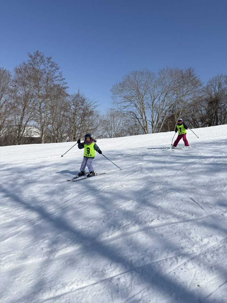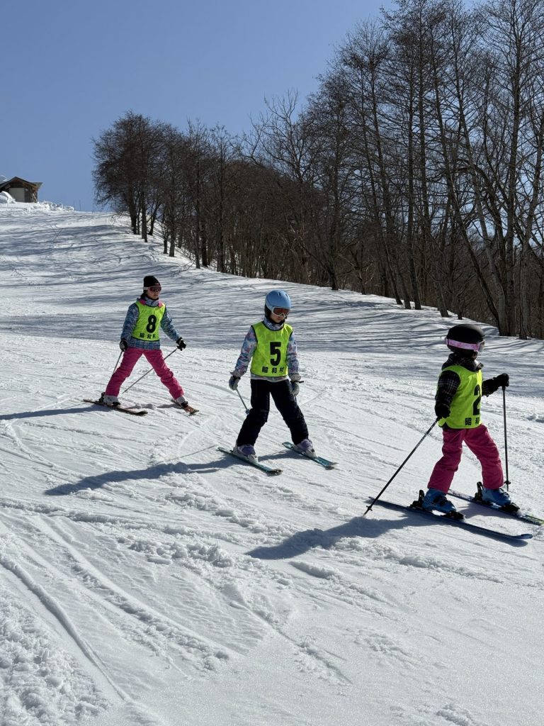 昭和村スキークラブのメンバーが講師を務め、レベルに合わせた班別の指導にあたりました。朝の整備したての圧雪も気温が上がってくるにつれ雪質は重く板が滑りにくいコンディションでしたが、講師のアドバイスをもとに児童それぞれの滑りの技術がレベルアップし難しいコースにも挑戦できました。終日晴天に恵まれた春めいた陽気の中、元気いっぱいゲレンデを滑走しスキーを楽しみました。