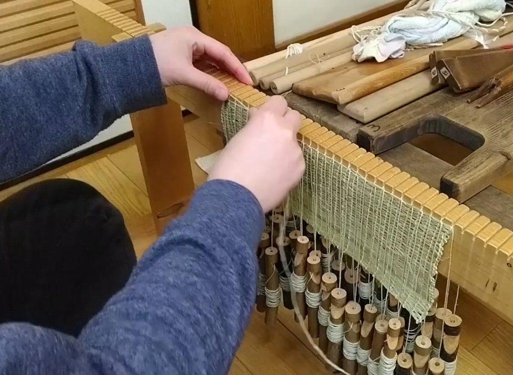 体験生は高機で半幅帯。研修生は2年やったんですけど、1年目は道の駅に展示するオブジェの布を作って、2年目に地機で男帯。村の地機講習会、楽しいです。自分は作らないで、人のやっているところを、ずーっと見ていてもいいなって(笑)。でも、見ていると結局やりたくなるんですよ。